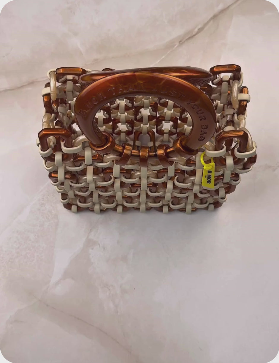 Interwoven lines, bold handles, and a mother-of-pearl finish in shades of caramel brown and beige. Every detail is designed to stand out, with just the right dose of boldness.