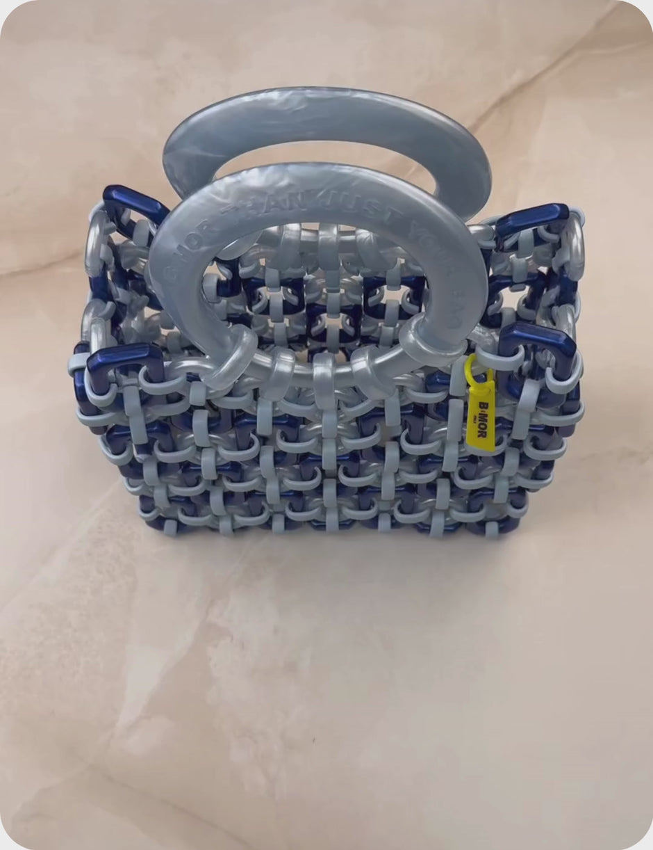 Interwoven lines, bold handles, and a mother-of-pearl finish in shades of blue and light blue. Every detail is designed to stand out, with just the right dose of boldness.