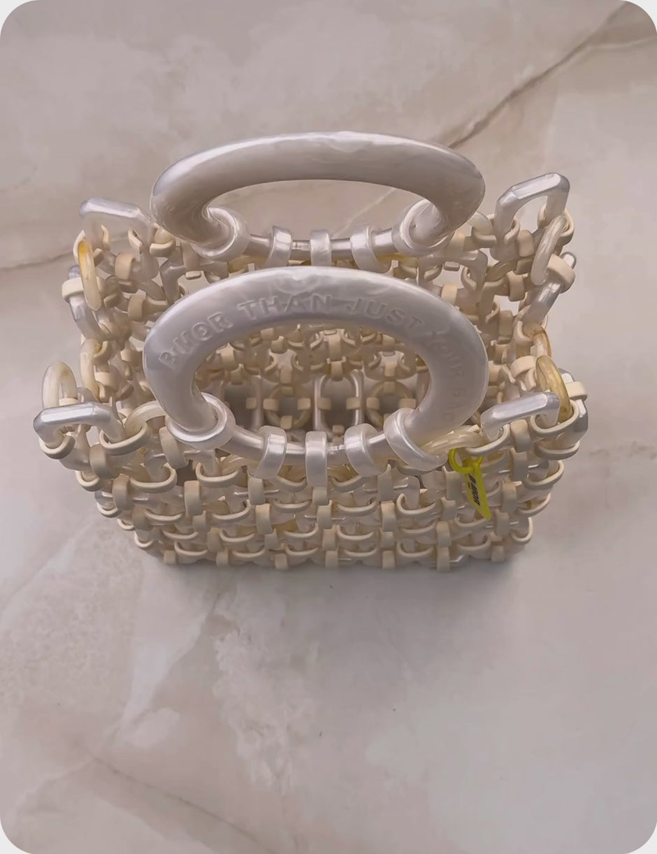 Interwoven lines, bold handles, and a mother-of-pearl finish in shades of white and light beige. Every detail is designed to stand out, with just the right dose of boldness.